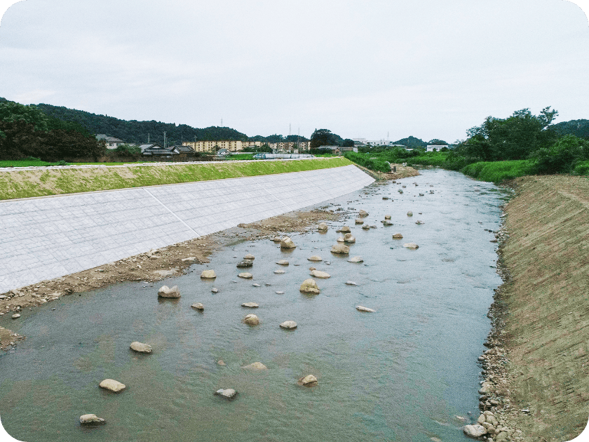 社会活動の基礎となる道路工事、河川・海岸改修工事、下水道工事、公園整備などのインフラの整備から、住宅の外構・造成工事といった民間工事まで。多岐にわたる工事に携わり、幅広い技術力で地域のみなさまの快適な暮らしを支えます。